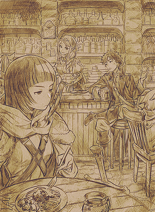 | 下校するエルルカは学院の友達と笑顔で別れると、アルバイトをしている“虎の鰭”亭に向かう。そつなく明るくこなしているが、彼女はあの店のルティンが苦手だった。なんとなく、心を見透かされる気がして。 | |||||