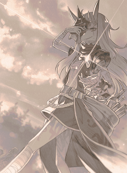 | 鬼人種の武闘家シヅキが一人杯を傾けていると、一人の鬼人種の男が彼の隣に腰を下ろした。 重い金棒が、テーブルに立てかけられる。 シヅキは面を下ろし、その男を見た。 「よぉ、シヅキ……」 そいつは面の奥で言う。 「表に出な。借りを返しに来たぜ……」 | |||||