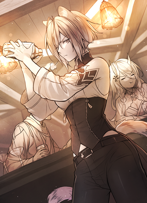 | 日が昇り街が目を覚ますころ、獣人アラワクの一日が終わる。酒のブレンド研究に余念のない彼女は、試作品をすべて飲み干してしまう。店の片付けも早々に、彼女は気分良く服を脱ぎ捨てて布団に潜り込むのだった。 | |||||