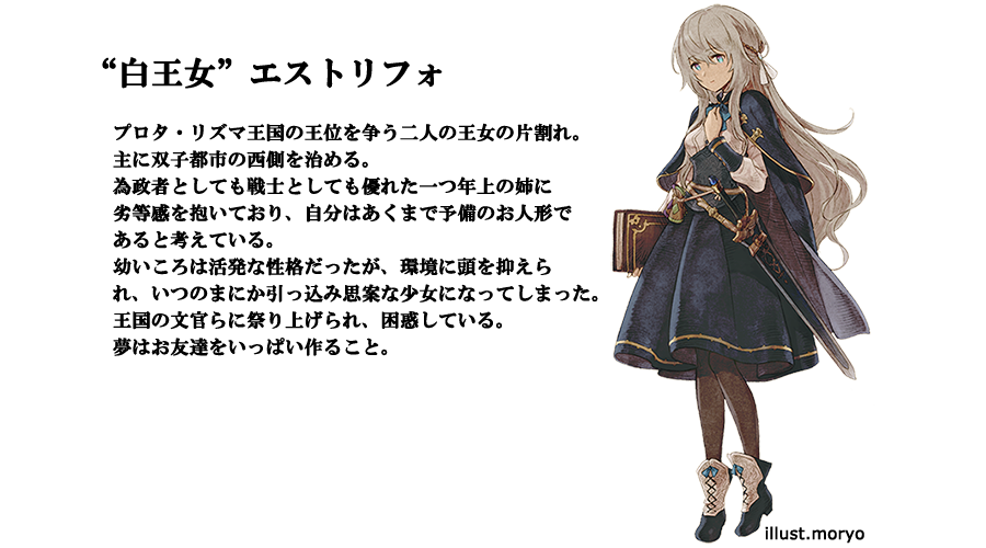 長く黒王女ヴェステルナの影のように地味な存在であり、そのくせ自由も与えられていなかったエストリフォのささやかな、しかしそれなりに高価なわがままだったが、メシュ・メシュは瞬く間に話をまとめ上げた。メシュ・メシュはもともとはエストリフォの家庭教師であり、それが国の高官たちを向こうに張って八面六臂の活躍を見せ、いつの間にか宰相の地位を手に入れている。「リフォちゃんを利用させてもらっているんだよネ」と、メシュ・メシュは言うが、エストリフォは彼女を信頼していた。