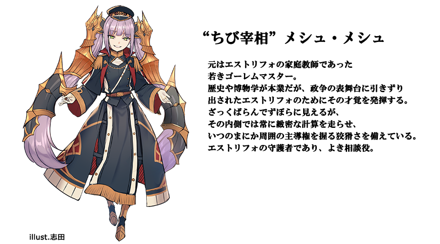 メシュ・メシュは若くして(正確な年齢をエストリフォは知らない)優れたゴーレム使いであり、また古典を研究する学者でもある。本来政治からは縁遠いはずだが、エストリフォよりも頭二つ小さい彼女はエストリフォを励まし、導いてくれた。