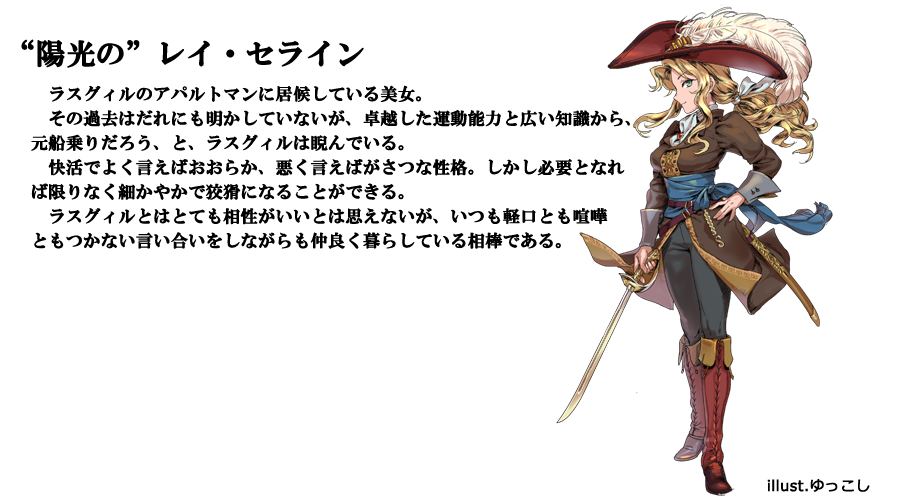 船乗りのようなコートを翻して、レイはスツールの上で足を組み直した。赤いジュストコールを腰のところでサッシュでまとめ、やはり繊細な彫金をほどこしたサーベルを吊っている。腰の後ろには小ぶりのピストルを差していて、ちょっとした銃士といった風情。