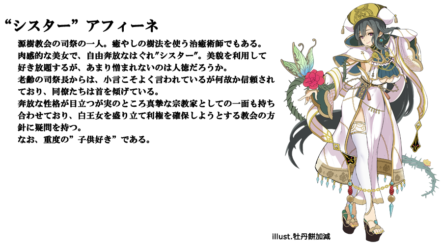 肌もあらわに改造されていたが、それは紛れもなく源樹教会の長衣であり、しかも見習いではなく司祭級を表す紋様が入っている。つまり、彼女はこの源樹教会聖堂でそれなりの地位があるということだ。